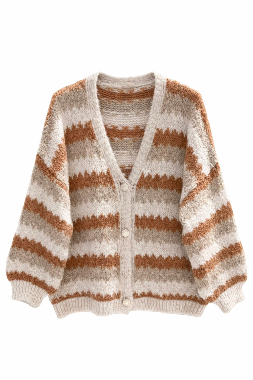 Eine wunderschöne, flauschige Strickjacke mit 3 Farbtönen, die deinen Look farbenfroher gestalten.