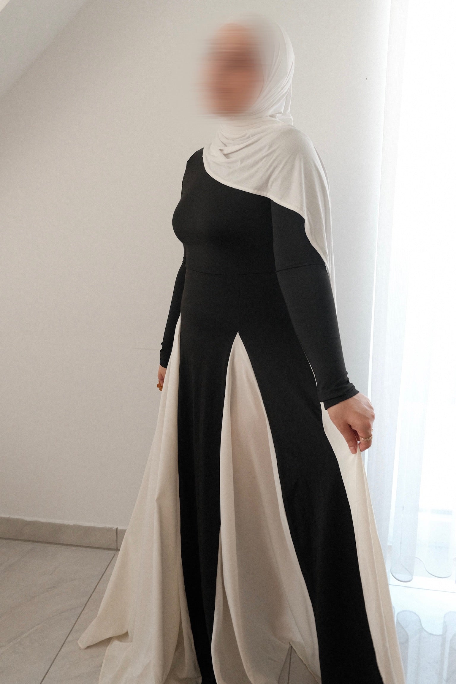 Wim fließendes Kleid mit schwarz weißen Akzenten. Perfekt für elegante und besondere Anlässe.